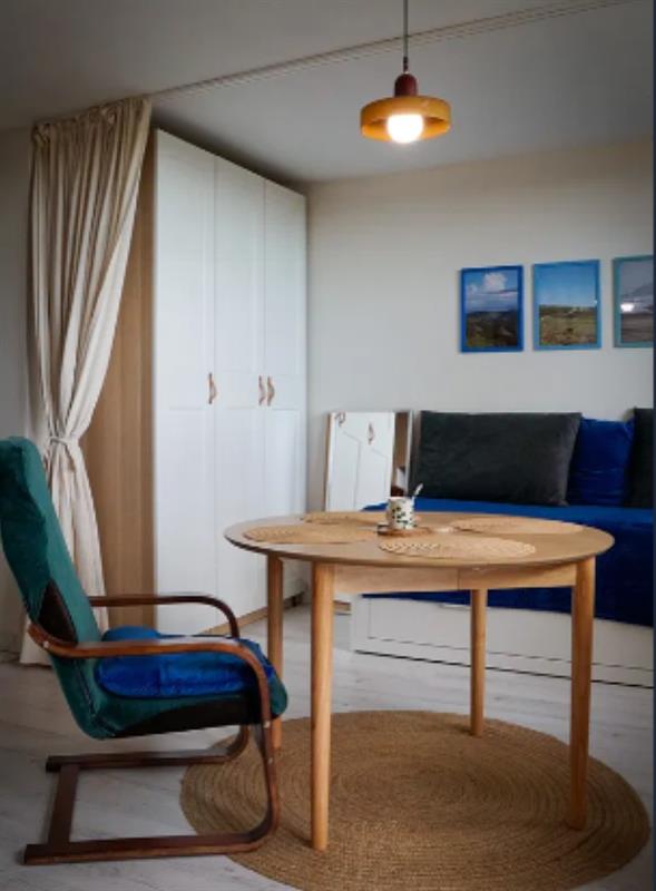 - pokoju z balkonem francuskim, aneksem kuchennym, wydzieloną częścią jadalnianą i miejscem do odpoczynku; w wyposażeniu aneksu piekarnik, kuchnia gazowa, zmywarka, pralko-suszarka, lodówka; część sprzętów AGD nadal na gwarancji