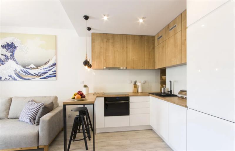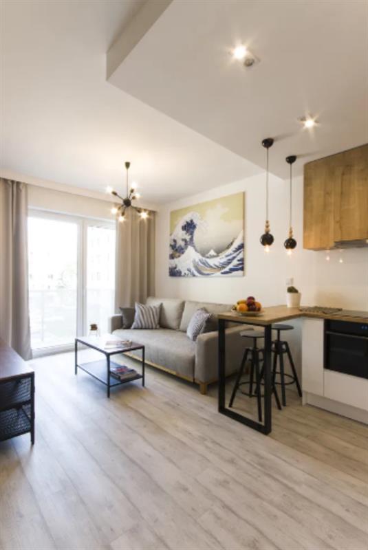 Mieszkanie wykończone w wysokim standardzie z dbałością o detal, całkowicie umeblowane i wyposażone (wszystkie meble na wymiar, sprzęt AGD, kuchnia sprzedawana łącznie z drobnymi elementami typu zastawa, garnki, sztućce). Wnętrze utrzymane w spójnej stylistyce – drewno dębowe, białe fronty, czarne dodatki. Ściana w salonie wykończona tynkiem strukturalnym, w łazience płytki heksagonalne szaro-białe. Całość wykonana według indywidualnego projektu.