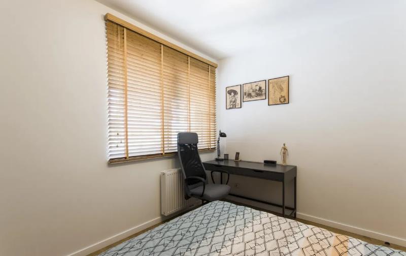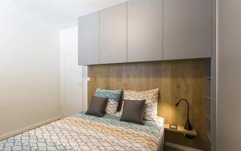 - W sypialni: łóżko dwuosobowe 160x200 z drewnianym panelem za wezgłowiem, wbudowane oświetlenie LED i półka nocna, szafa z przesuwnymi drzwiami + szafki górne pod sam sufit – wszystko na wymiar