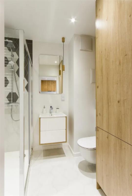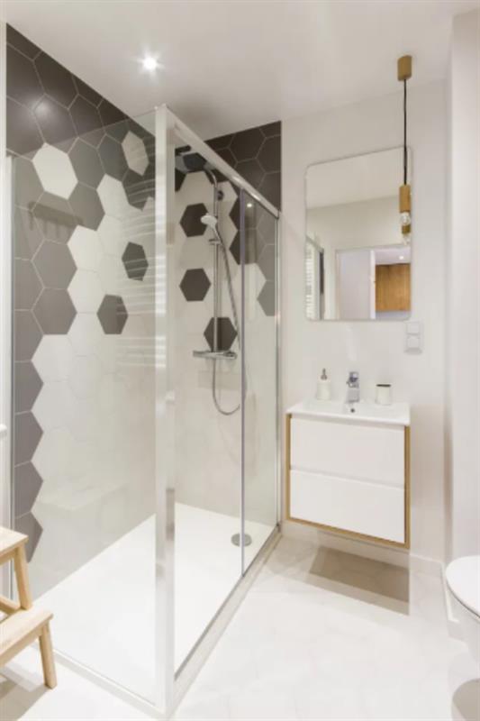 - Płytki heksagonalne szaro-białe na ścianie prysznicowej